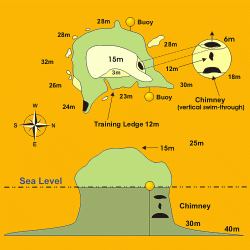 La característica más notable de la inmersión es la llamada “chimenea”, un túnel vertical en la roca que conduce desde los 18 a los 6 m. por donde penetra la luz natural; este agujero se encuentra rodeado de una magnífica alfombra de anémonas rosadas. A los 12 m. se abre otro agujero por el que también es posible salir a aguas abiertas. Todo el lugar, hasta los 40 m. de profundidad, merece la pena ya que la roca entera está llena de pequeños agujeros que constituyen un hábitat perfecto para todo tipo de especies marinas: morenas de ojos blancos, maravillosas anémonas, grandes pelágicos como la barracuda chevron, cardúmenes de atunes y jureles (Caranx ignobilis) y, en ocasiones, el tiburón toro. También es posible ver el tiburón ballena y matas raya.