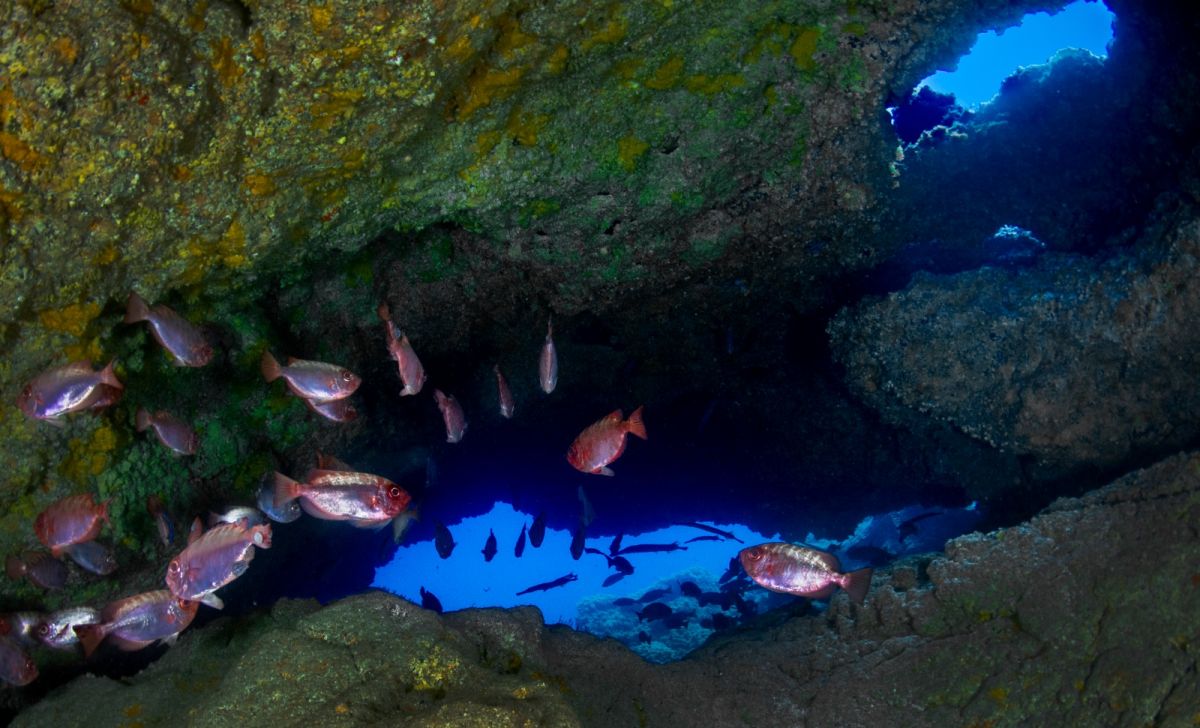 Una cueva preciosa con muchas salidas y decenas de peces haciendo contraluces al azul en multitud de aberturas. Este día estuvo especialmente espectacular con más de cien peces acumulados en la cueva y sus salidas.