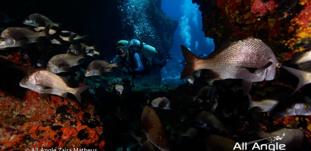 “Pedras Secas” es el punto de inmersión más famoso de Noronha y uno de los mejores de Brasil. Su nombre es debido a las formaciones rocosas que se elevan a la superficie. En la parte más profunda (sobre los 20 m.) se forman corredores, cañones, arcos y pequeñas cuevas, donde se pueden encontrar enormes cardúmenes de hemúlidos roncadores (Anisotremus surinamensi). Otras especies frecuentes langostas, cangrejos y pulpos. No es raro encontrar rayas, tortugas verdes y tiburones, especialmente nodrizas y de arrecife. La presencia de delfines hacen que ésta sea una inmersión inolvidable.