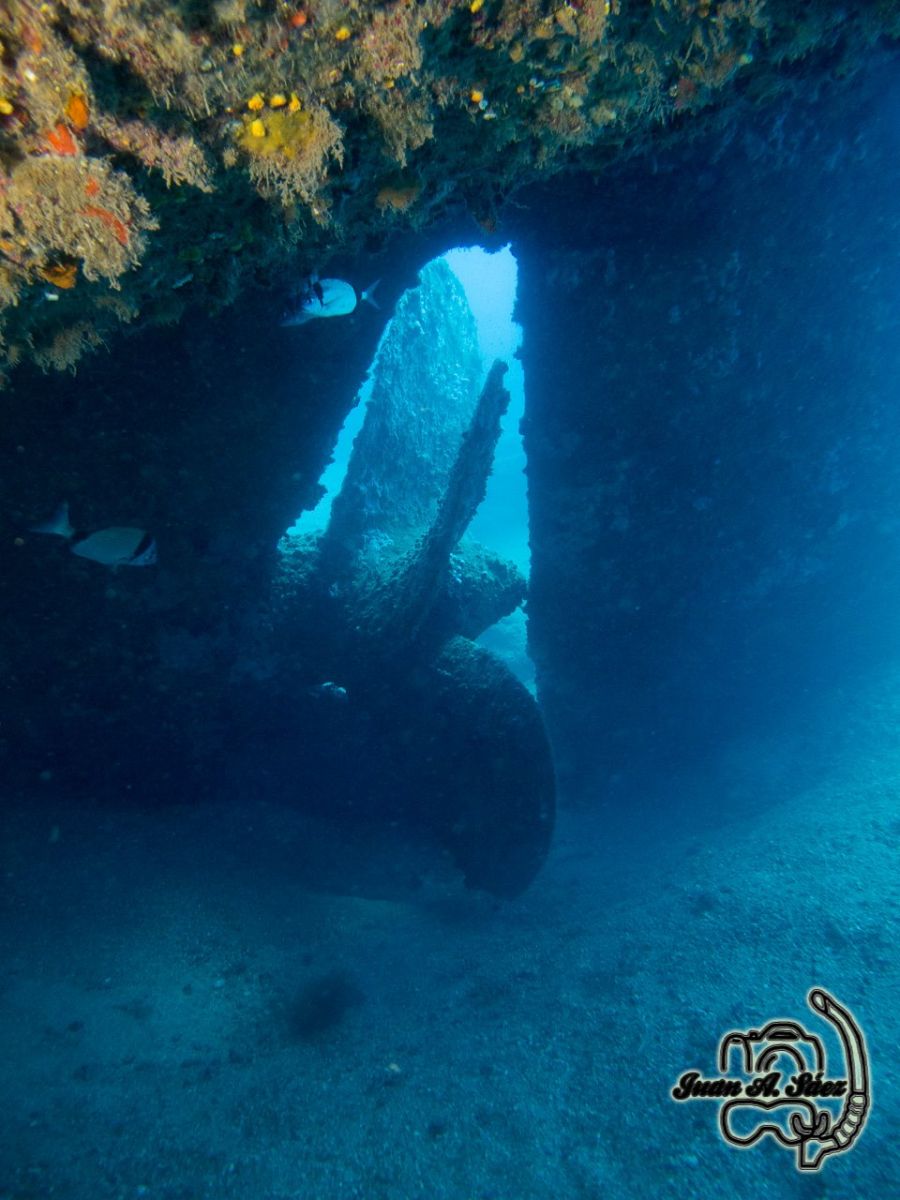 El Pellworn, que ese era su nombre, era un remolcador de altura alemán que participó en la Segunda Guerra mundial y tras diversas vicisitudes acabó hundido como arrecife artificial. Cuidado, como siempre, en las penetraciones en pecios. En este caso las estrellas son la bodega con su cámara de aire y la sala de máquinas.