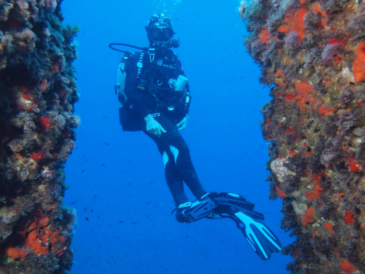 Es Vedranell es un islote situado al Este de Es Vedra con una altura de 128 metros y formado por altos acantilados casi inaccesibles. La inmersión se realiza en la parte Noroeste de la isla y consiste en atravesar una serie de cañones submarinos abiertos en el acantilado en dirección Norte-Sur. Fondeamos la embarcación sobre un fondo rocoso de 4 metros de profundidad y nos dirigimos hacia el Oeste, manteniendo la pared en nuestra derecha, donde nos encontramos muy pronto con el primer cañón de 8 metros de profundidad, nada más atravesarlo doblamos hacia la izquierda y a los pocos metros nos topamos con el segundo: el más espectacular de todos y también el más profundo: 26 metros. La sensación al entrar en él es indescriptible, todas sus paredes están repletas de multitud de anémonas amarillas, esponjas, madréporas, es el paraíso de los nudibranquios e incluso en alguna inmersión hemos llegado a ver algún ejemplar raro de morena verde. Al salir de este cañón ( muy a pesar nuestro pues nos quedaríamos toda la inmersión dentro de él) torcemos otra vez a la derecha para entrar en el último cañón de unos 22 metros de profundidad.