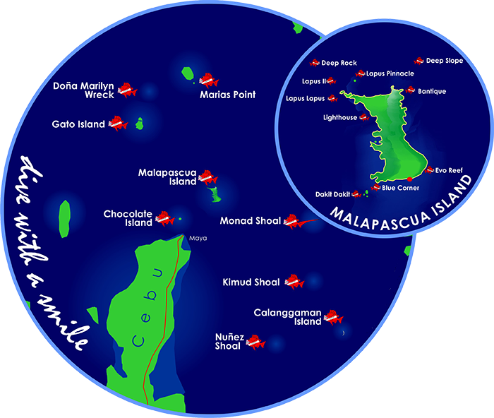 Monad Shoal es una isla sumergida de 1,5 km. de longitud rodeada por una caída de más de 200 m., encontrándose lo mejor para bucear en un rango de entre 20 y 27 m. Emplazada a unos 7,8 km. de Malapascua, el trayecto nos llevará unos 40 minutos en barca. Sin duda es uno de los puntos estrella de Malapascua por ser el único lugar del mundo donde se pueden observar los escurridizos tiburones zorro pelágicos (Alopias pelagicus) con regularidad durante todo el año, aunque también pueden verse las otras dos especies: el tiburón zorro de anteojos (Alopias superciliosus) y el zorro marino o tiburón azotador (Alopias vulpinus). Chris Mitchell, de Sport Dive, considera esta inmersión como uno de los puntos de inmersión principales de toda la región de Asia-Pacífico.