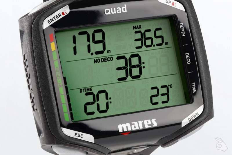 Ordenador para buceo Quad multimezcla de MARES, de pantalla grande. Pantalla extraordinariamente clara con datos de formato gigante y dos campos personalizables para información auxiliar. Nuevo con sello y garantía de la marca.